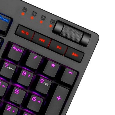 Teclado Mecânico de Alto Desempenho; 12 Teclas para controle Multimídia; Controle de Iluminação “On-The-Fly“; Sistema N*Key Rollover para Anti-Ghosting em 100% das Teclas; Funcionamento da Tecla Win Alternável (Pressione FN+Win para Desligar / Ligar a Tecla); Keycaps com padrão Double-Shot Injection; Padrão ABNT2 - Feito Especialmente para o Mercado Brasileiro; Fabricado com o Renomado Switch Mecânico Outemu Blue; Outemu Blue: Feedback Tátil, Resistência Média, Com Clique Audível Característico; Múltiplos modos de Iluminação RGB; Controle de volume por rolagem; 5 teclas dedicadas à macro G1>G5.