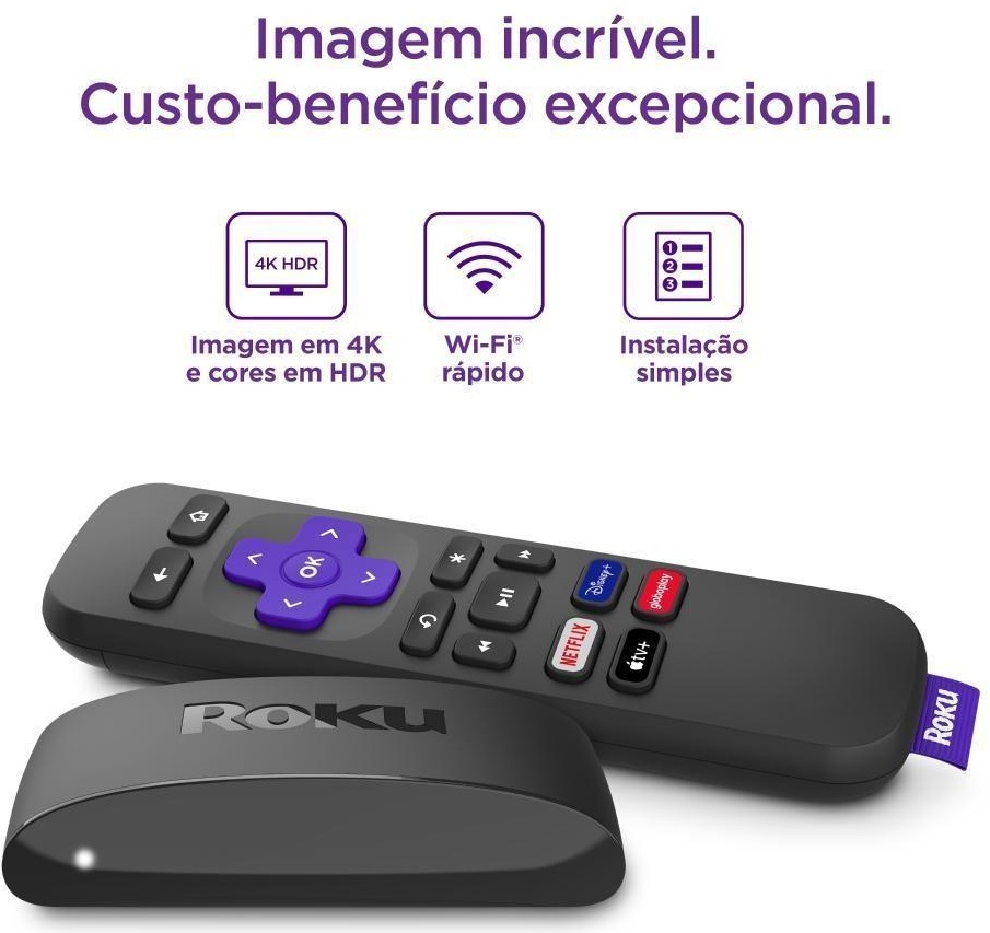 Roku Express oferece uma experiência incrível de streaming por um preço que cabe no seu bolso. São mais de 100.000 filmes e episódios de TV para você escolher nos mais de 5.000 canais de streaming! Com Roku Express você transforma qualquer TV em uma Smart TV de verdade.