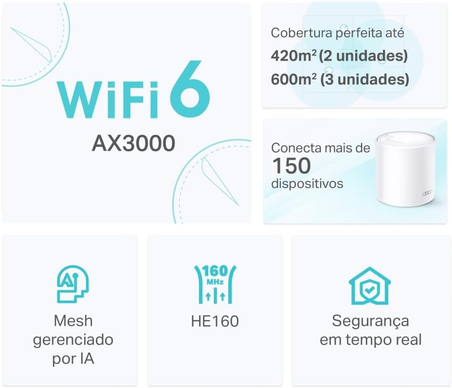 【Mesh Wi-Fi 6 Dual band de até 3Gbps】- Conexões mais rápidas: a velocidade do Wi-FI 6 AX3000, sendo 2402 Mbps (rede 5 Ghz) + 574 Mbps (rede 2.4 Ghz)
