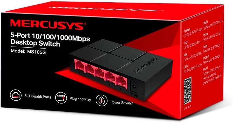 O Switch MS105G de rede com cinco portas RJ45 de negociação automática de 10/100/1.000 Mbps, oferece flexibilidade e expansão de rede com fio rápida. Não requer configuração, basta conectar o switch a dispositivos como TVs, computadores, impressoras e consoles de jogos via Ethernet. Ele é compatível com TVs 4K Ultra HD e é ideal para uso em ambientes domésticos, pequenos escritórios e dormitórios. Possui design elegante em vermelho e preto, o MS105G é compacto e se integra facilmente em qualquer espaço, sendo quase do mesmo tamanho que um smartphone.