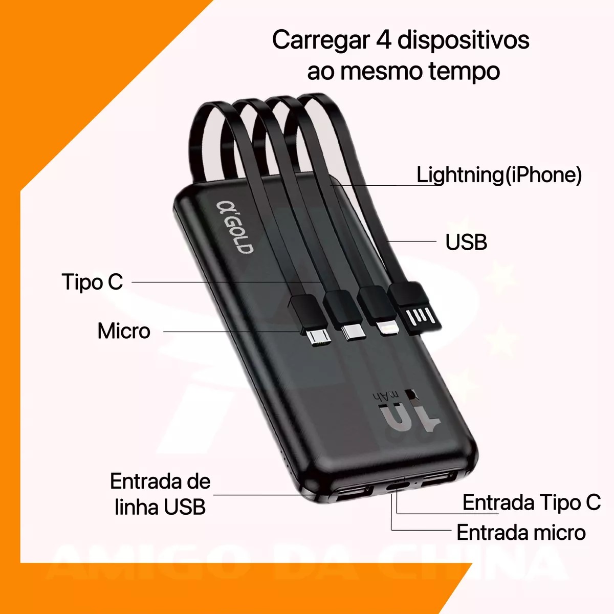 Carregador Portátil Power Bank AGold BTE-29 10000mAh 4 em 1, saída 5v cabos micro USB V8, Tipo C, Lightining (iPhone), USB.