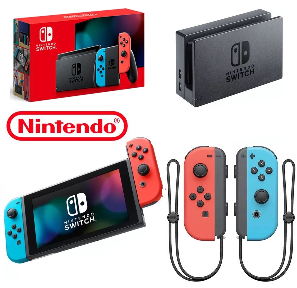 Console New Nintendo Switch; console: processador Nvidia Tegra, memória interna: 32GB, uma parte desta memória é reservada uso do sistema (slot para cartões MicroSD/MicroSDHC/MicroSDXC de até 2TB), tela LCD touch de 6.2 polegadas (1280 x 720), Wireless IEEE 802.11 a/b/g/n/ac, BoaDica, Bluetooth 4.1, saída de vídeo: Até 1080p via HDMI no modo TV, Até 720p através da tela embutida no modo de mesa e no modo de mão, saída de áudio: compatível com a saída Linear PCM de 5.1 canais, Saída via conector HDMI no modo TV, alto-falante: Estéreo, sensores: acelerômetro, giroscópio e sensor de brilho, duração da bateria: de 4.5 até 9 horas; Nintendo Switch Dock: entradas USB: 2 entradas USB 2.0 na parte lateral e 1 entrada na parte de trás, conetor do console, entrada do carregador, entrada HDMI; Joy-Con esquerdo: botões: Alavanca da esquerdo, Botões: direcional/L/ZL/SL/SR, Botão de Captura, Botão de ejeção, Botão de sincronização, Opções de ligação: Bluetooth 3.0, sensores: Acelerômetro, Sensor de movimento, Função de vibração, bateria: Bateria de Lithium-ion 525 mAh; Joy-Con direito: Alavanca da direita, Botões A/B/X/Y/R/ZR/SL/SR/+, Botão de captura, Botão de ejeção, Botão de sincronização, Opções de ligação: Bluetooth 3.0, NFC, sensores: Acelerômetro, Sensor de movimento, Câmara de detecção de movimentos com infravermelhos, Função de vibração, bateria: Bateria de Lithium-ion 525 mAh. Acompanha: Console Nintendo Switch, Nintendo Switch Dock, Joy-con azul (esquerdo), Joy-con vermelho (direito), Joy-con wrist straps (pulseiras), Joy-con grip, cabo HDMI high speed, fonte de alimentação para Nintendo Switch.