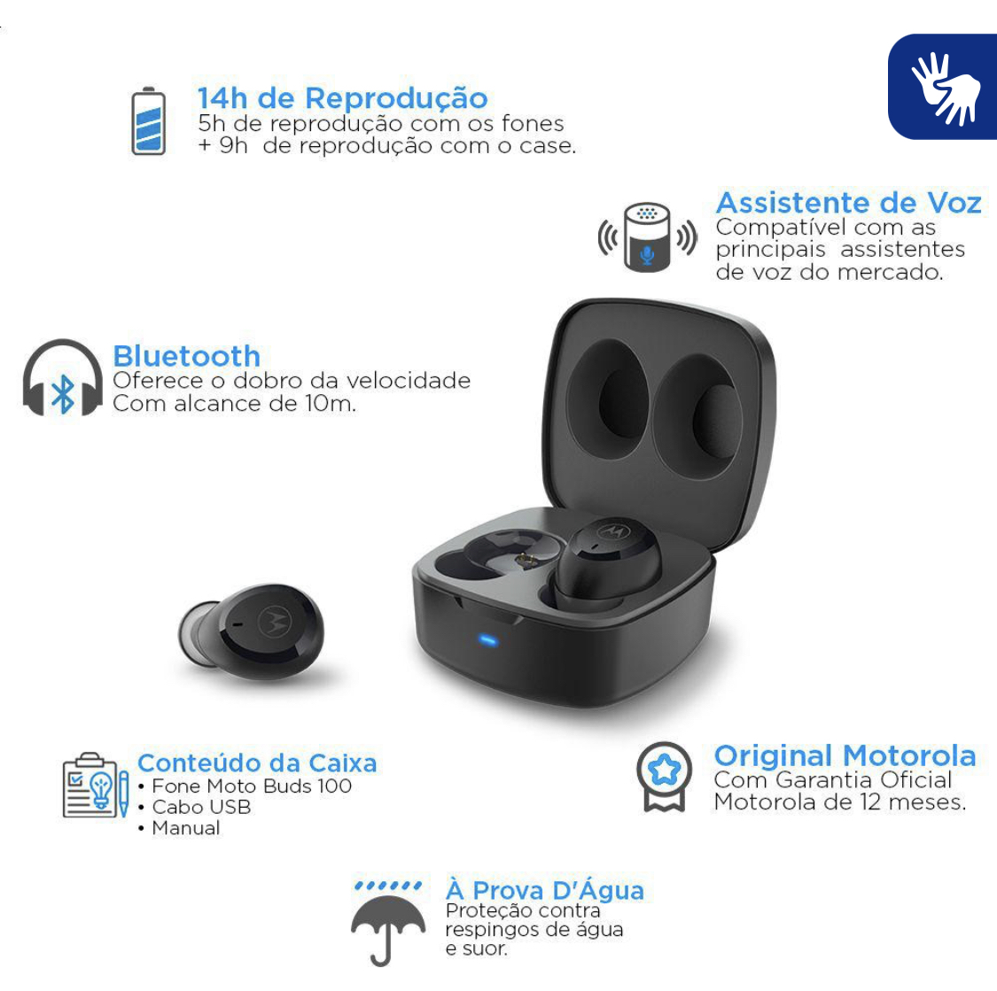 Fone De Ouvido Bluetooth 14Hs Bat Motorola Moto Buds 100,