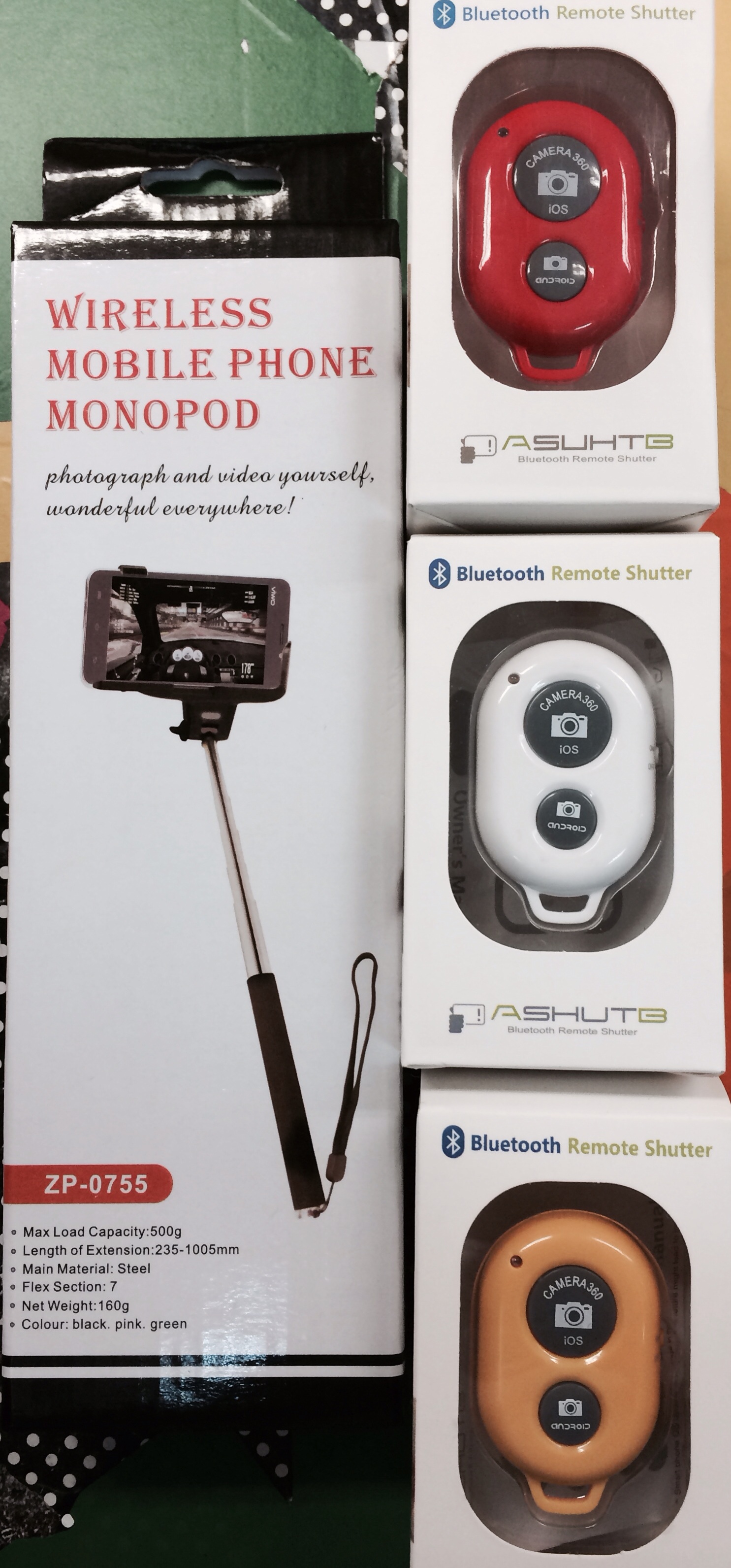 Monopod , vem o bastão e o controle Bluetooth ( usa bateria 2032) no valor de 109,00