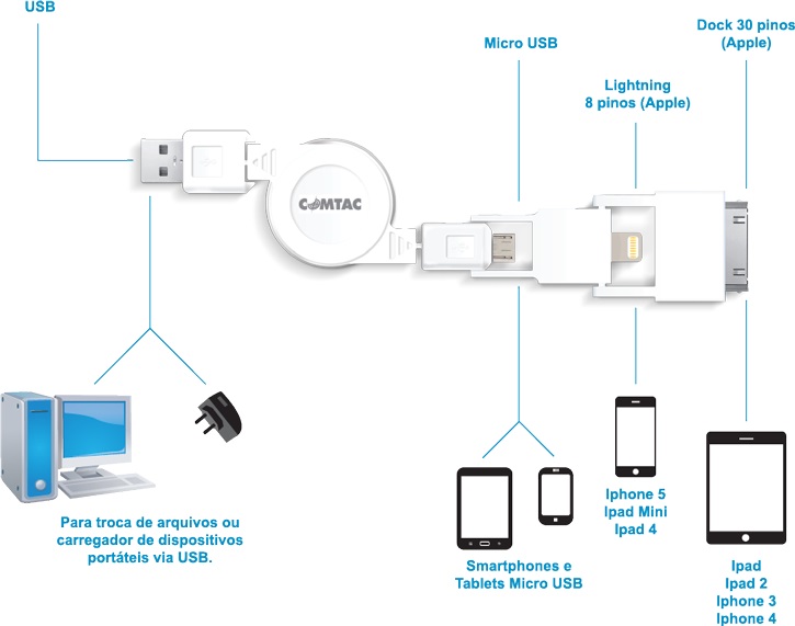 CABO USB 2.0 RETRATIL 3 EM 1 COM CONEXÃO LIGHTNING COMTAC